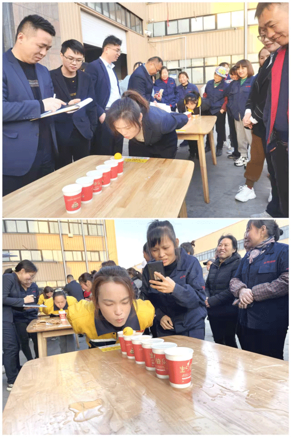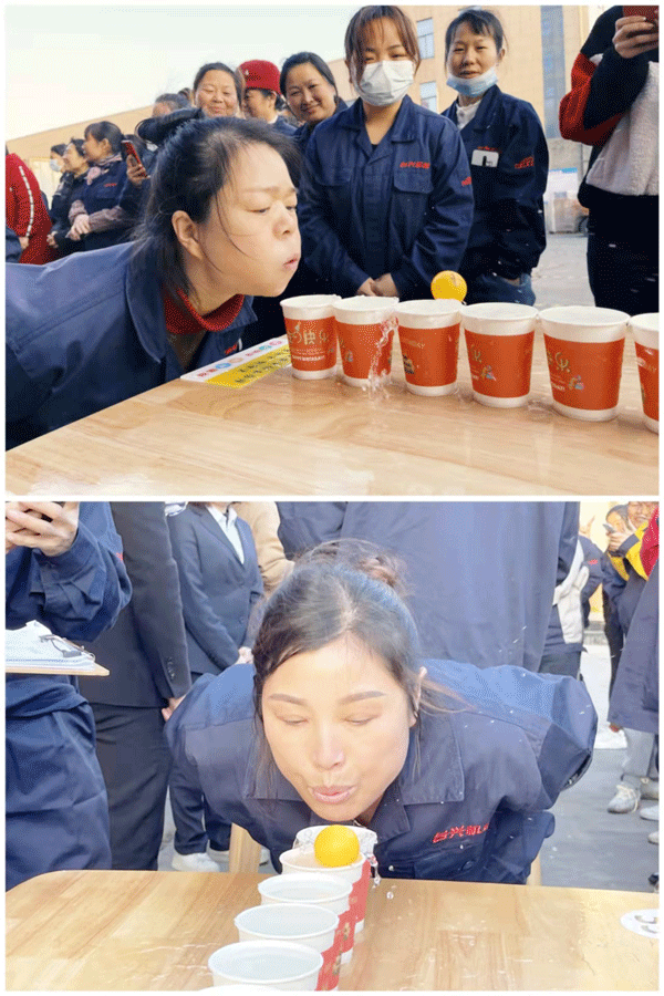 第一個(gè)游戲——“魚(yú)躍龍門(mén)”,共18名參賽選手,分3組,每組6人,每人面前有6個(gè)裝滿(mǎn)水的水杯,第1個(gè)水杯里放置乒乓球1枚,參賽者要用嘴巴吹氣,將乒乓球從第1個(gè)杯子吹到第6個(gè)杯子,并且要一個(gè)接一個(gè)地吹至下一個(gè)杯子內(nèi),直到吹入最后一個(gè)杯子,最后計(jì)算總成績(jī),以用時(shí)最少的為勝。裁判長(zhǎng)發(fā)令槍聲一響,所有人員都嚴(yán)格按照規(guī)則,氣運(yùn)丹田,卯足干勁,細(xì)心地、嚴(yán)謹(jǐn)?shù)?、精?zhǔn)地吹動(dòng)乒乓球。游戲中,有不滿(mǎn)20歲的小姑娘,也有年近退休的老大姐,大家都積極踴躍地參與。有的選手費(fèi)了九牛二虎之力將乒乓球吹到第五個(gè)水杯時(shí),卻不慎將球吹出了杯子,結(jié)果按照規(guī)則,必須重新開(kāi)始。她們有懊惱跺腳的,也有開(kāi)心鼓掌的,旁邊的觀眾也是群情高昂,吶喊聲、加油聲、歡笑聲不絕于耳,一開(kāi)始就將整個(gè)活動(dòng)推向了高潮。