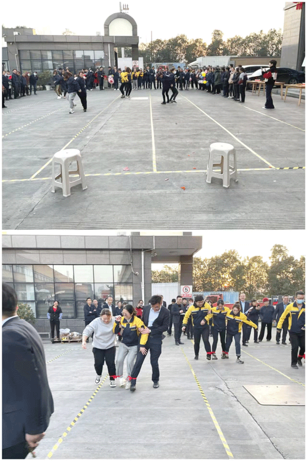 第二個(gè)游戲——“三人四足”,共60名參賽選手,3人組隊(duì),每隊(duì)站成一排,中間選手的左右腳與兩邊選手的右左腳用綁帶綁在一起(踝關(guān)節(jié)處),每隊(duì)選手在自己的跑道上集體前進(jìn),往返一趟,最后計(jì)算出所有參賽成績(jī)。60名選手,分別來(lái)自新廠、老廠、第二事業(yè)部的各個(gè)部門(mén),女職工們還特邀“男伴”助陣?;顒?dòng)中,選手們精心準(zhǔn)備,從系綁帶,到排練、到找節(jié)奏,好不熱鬧。當(dāng)裁判長(zhǎng)發(fā)令槍響起后,各隊(duì)選手邁著鏗鏘的步伐,在各自的節(jié)奏口令里,緊張有序地前行。有快速通過(guò)的,有慢而整齊的,也有不慎摔倒的,旁邊還有被現(xiàn)場(chǎng)氛圍感染的觀眾們。