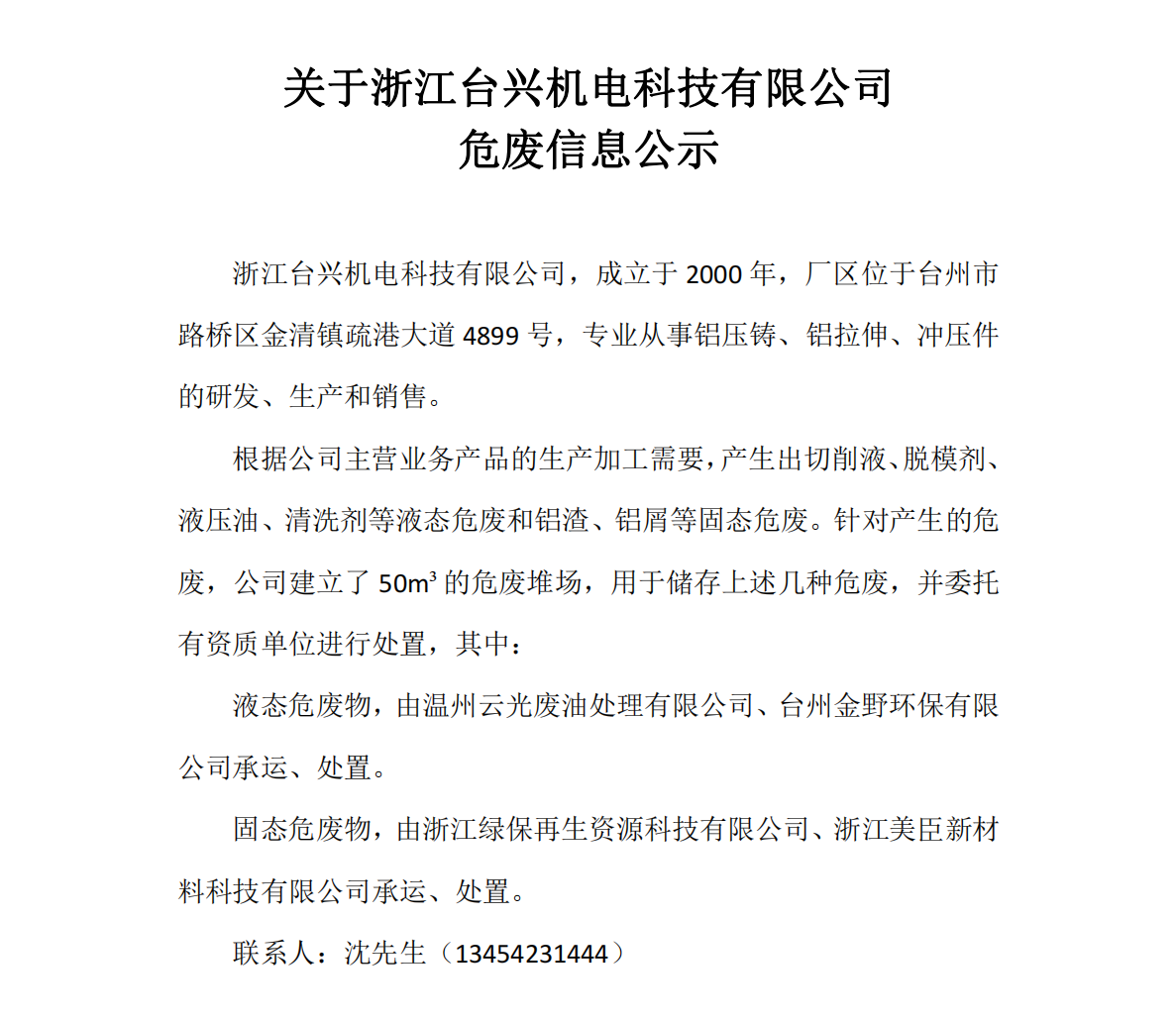 關(guān)于浙江臺(tái)興機(jī)電科技有限公司危廢信息公示